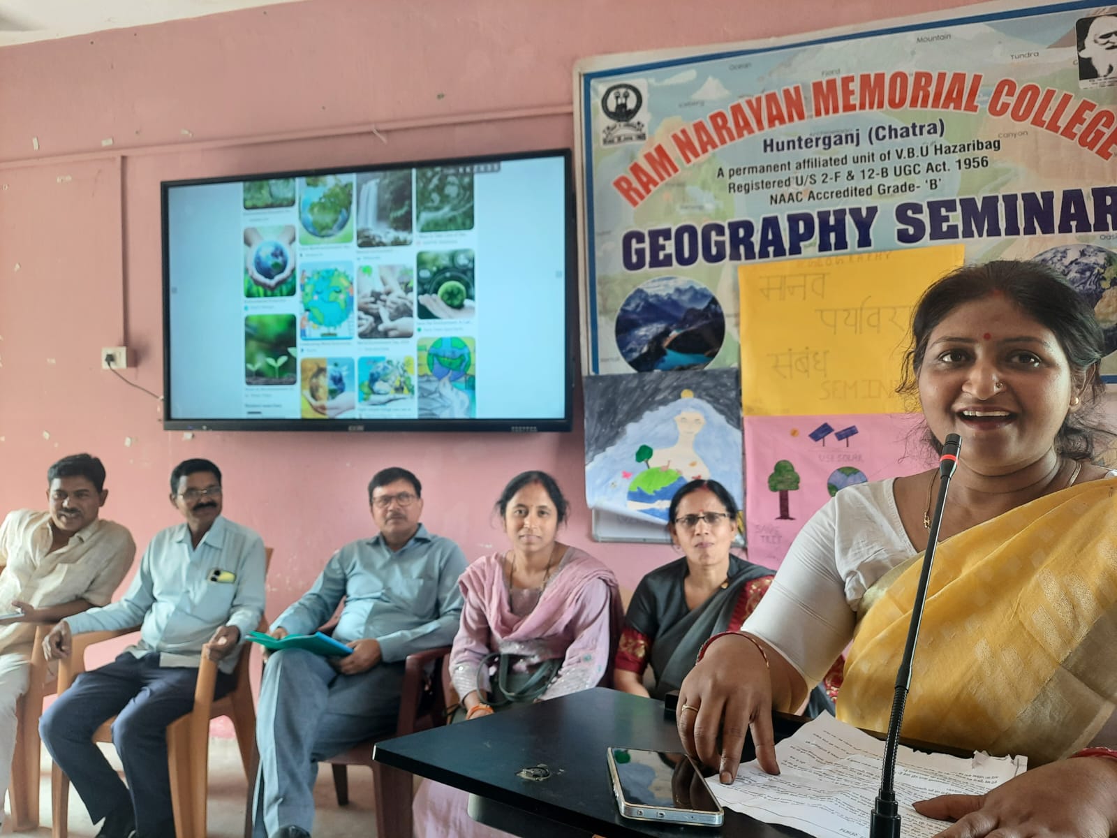 Chatra : हंटरगंज के राम नारायण मेमोरियल कॉलेज के सभागार मे भूगोल विभाग के द्वारा मानव का पर्यावरण से संबंध पर एक महत्वपूर्ण सेमिनार का आयोजन किया गया। इस सेमिनार की अध्यक्षता भूगोल विभाग की अध्यक्षा पूजा कुमारी सिंह ने किया।जबकि संचालन एनएसएस पीओ डा० फहीम अहमद और कॉलेज की छात्रा शौर्या कुमारी ने संयुक्त रूप से किया।इस विश्वव्यापी ज्वलंत मुद्दे पर रिया कौर पुष्पा कुमारी ज्योति गुप्ता,प्रिया कुमारी रंजन रवि,विक्रम कुमारऔर शौर्या कुमारी ने प्राकृतिक संपदा का दुरुपयोग और विकास के नाम पर विभिन्न तरह के हानिकारक गैसों का विसर्जन से पृथ्वी पर रहने वाले जीव जंतुओं पर दुष्प्रभाव पड़ रहा है।सेमिनार पेपर पढ़ने के माध्यम से कहा गया है कि मानव द्वारा आधुनिक युग में विकसित सामग्रियों का बड़े पैमाने पर उपयोग किया जाना भी पृथ्वी को काफी नुकसान पहुंचा रहा है। जिस से पृथ्वी पर असमय मौसम परिवर्तन होना बताया गया है।कल कारखाना और उद्योग लगने के नाम पर बड़े पैमाने पर जंगलों की कटाई की जा रही है।जिस से पृथ्वी पर रहने वाले मानव और जीव जंतु को काफी नुकसान हो रहा है।पृथ्वी और प्राकृतिक का मनुष्यों पर कुछ कर्ज भी है जिसे अदा करने के लिए बरसात के मौसम में अभियान के रूप में घरों मोहल्लों और कॉलेज में पौधा रोपण का कार्यक्रम किए जाने का संकल्प लिया गया।इस मौके पर रुसा कोऑर्डिनेटर प्रो फखरुद्दीन अंसारी,आई क्यू एस सी कोऑर्डिनेटर प्रो अनिल कुमार सिंह,सेक्सुअल हार्समेंट सेल की कॉर्डिनेटर प्रो कुमारी मंजू सिंह,लाइब्रेरी इंचार्ज प्रो रामजीत यादव,प्रो स्वेता सिंह के अतिरिक्त कॉलेज के कई व्याख्याता,कर्मी और  छात्र एवं छात्रा उपस्थित थे।