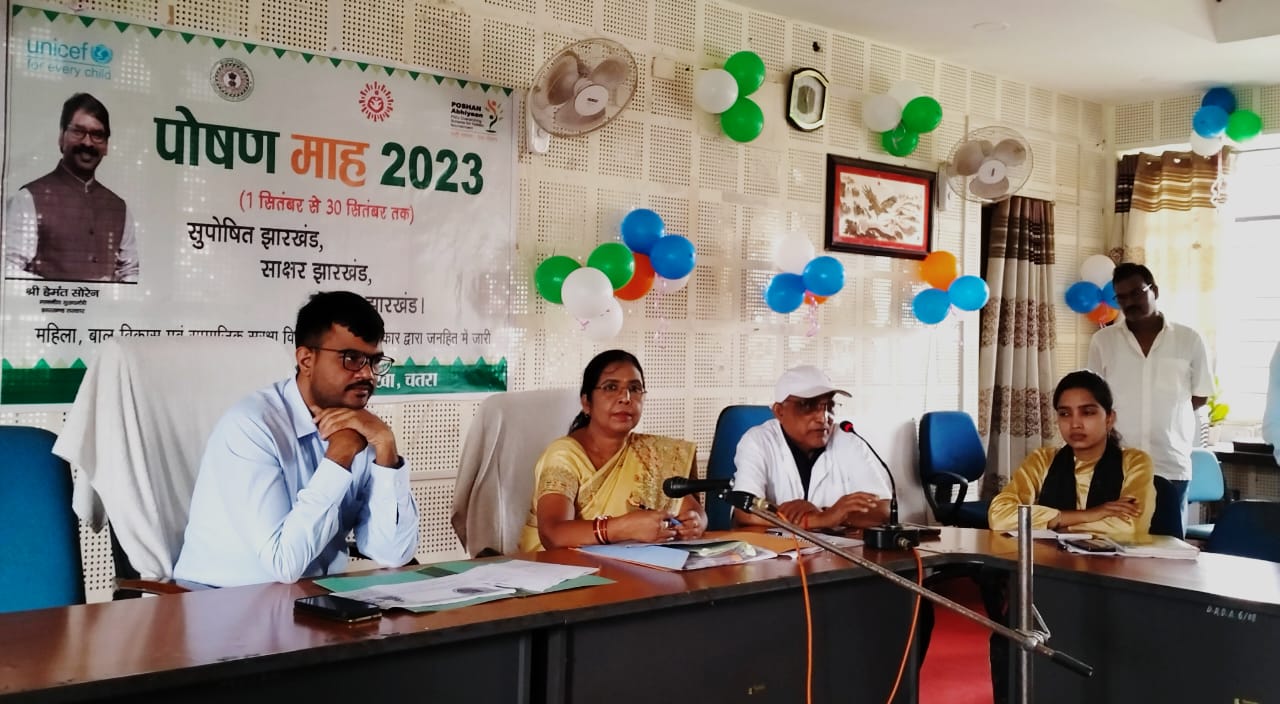 चतरा उपायुक्त अबु इमरान के निर्देशानुसार डी0आर0डी0ए0 सभा कक्ष में उप विकास आयुक्त उत्कर्ष गुप्ता की अध्यक्षता में पोषण माह अंतर्गत विभिन्न विभागों द्वारा किये जा रहे गतिविधियों का जन आंदोलन डैशबोर्ड में प्रविष्टि को लेकर बैठक आयोजित की गई।बैठक में उप विकास आयुक्त ने अब तक किये गए गतिविधियों का जन आंदोलन डैशबोर्ड में प्रविष्टि की समीक्षा की। जिसमें समाज कल्याण के अलावे स्वास्थ्य विभाग, शिक्षा विभाग, कृषि विभाग, पंचायती राज, ग्रामीण विकास विभाग, जे0एस0एल0पी0एस आदि शामिल है।उप विकास आयुक्त ने सभी महिला पर्यवेक्षिकाओं को 25 सितंबर तक जन आंदोलन डैशबोर्ड में सभी परियोजना को शत प्रतिशत इंट्री करने का निर्देश दिया। आगे उन्होंने कहा 26 सितंबर को फिर से समीक्षा की जाएगी। वहीं सिविल सर्जन चतरा ने भी सभी महिला पर्यवेक्षिकाओं से टीकाकरण के ड्यू लिस्ट पर चर्चा की, साथ ही एनीमिया से बचाव, आंगनबाड़ी केंद्रों में बच्चों के बीच होने वाले टीकाकरण कार्य में तेजी लाने की बात कही।राज्य पोषण मिशन रांची से आए एस0बी0सी0सी कंस्लटेंट मृत्युंजय नायक ने पोषण माह अंतर्गत विभिन्न विभागों द्वारा आयोजित किये गए विभिन्न गतिविधियों का जन आंदोलन डैशबोर्ड में अब तक किये गए प्रविष्टि के बारे में बताया। वहीं जन आंदोलन डैशबोर्ड में प्रविष्टि को लेकर जिले की रैंकिंग में कैसे सुधार हो इस संदर्भ में चर्चा करते हुए महिला पर्यवेक्षिकाओं को कई दिशा निर्देश भी दिए। साथ ही पोषण ट्रैकर, सी0बी0ई0 कार्यों की समीक्षा कर पोषण ट्रैकर के सभी इंडीकेटरों की इंट्री अविलंब पूर्ण करने करने का निर्देश दिया गया।बैठक में जिला समाज कल्याण पदाधिकारी चतरा, जिला शिक्षा पदाधिकारी, जिला कृषि पदाधिकारी चतरा, सिविल सर्जन चतरा, बाल विकास परियोजना पदाधिकारी हंटरगंज, तेजस्विनी परियोजना के समन्वयक, सभी महिला पर्यवेक्षिका, कार्यालय कर्मी समेत सेविका/सहायिका उपस्थित थे।बैठक के पश्चात पर्यवेक्षिकाओं और सेविका/सहायिकाओं ने निकाली पोषण जागरूकता रैलीबैठक के पश्चात महिला पर्यवेक्षिकाओं और सेविका/सहायिकाओं ने पोषण माह के तहत पोषण जागरूकता रैली निकाली। नगर भ्रमण करते हुए विभिन्न चौक-चौराहों पर लोगों के बीच पोषण के तहत जागरूकता संदेश फैलाया। रैली में विभिन्न विभागों के पदाधिकारी व कर्मी भी शामिल हुए।