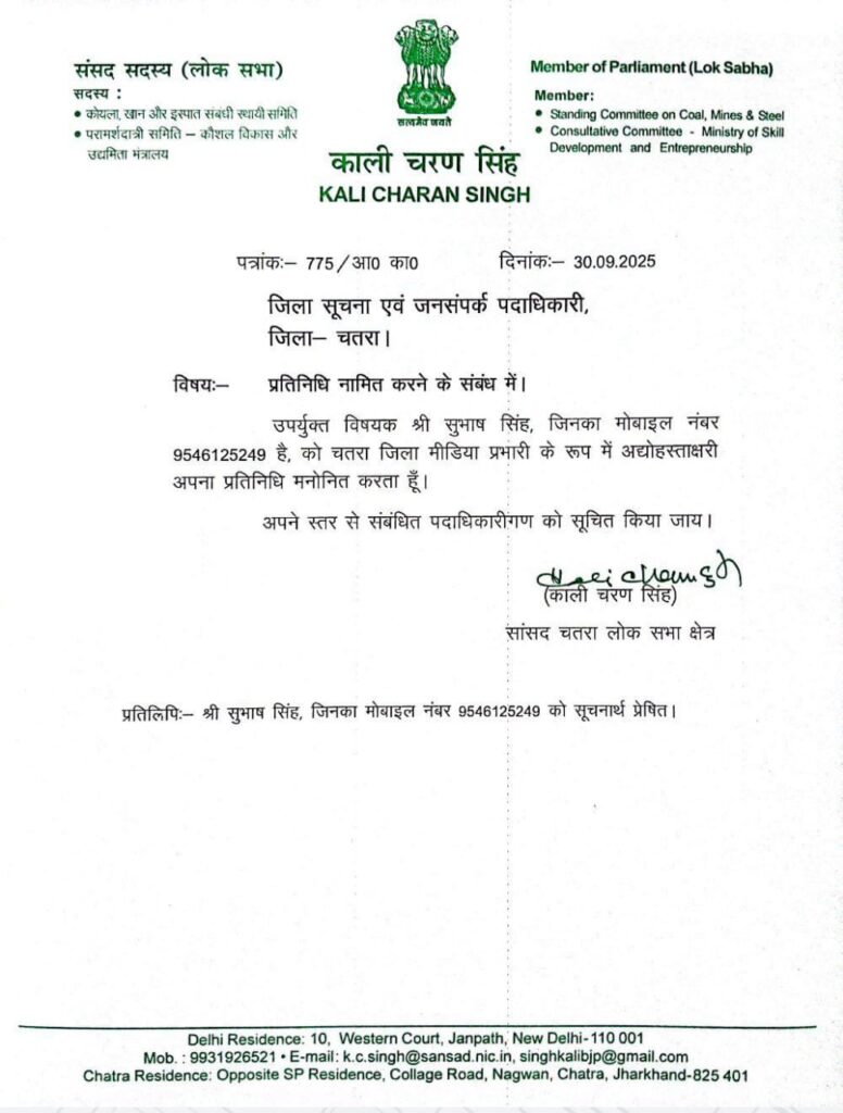 चतरा : जिले के सलगी निवासी व भाजपा युवा नेता सुभाष सिंह को बड़ी जिम्मेदारी मिली है। चतरा सांसद कालीचरण सिंह ने उन्हें अपना जिला मीडिया प्रभारी प्रतिनिधि नियुक्त किया है। इस संबंध में सांसद ने पत्र जारी कर जिला सूचना एवं जनसंपर्क पदाधिकारी, चतरा को भी औपचारिक सूचना दे दी है।