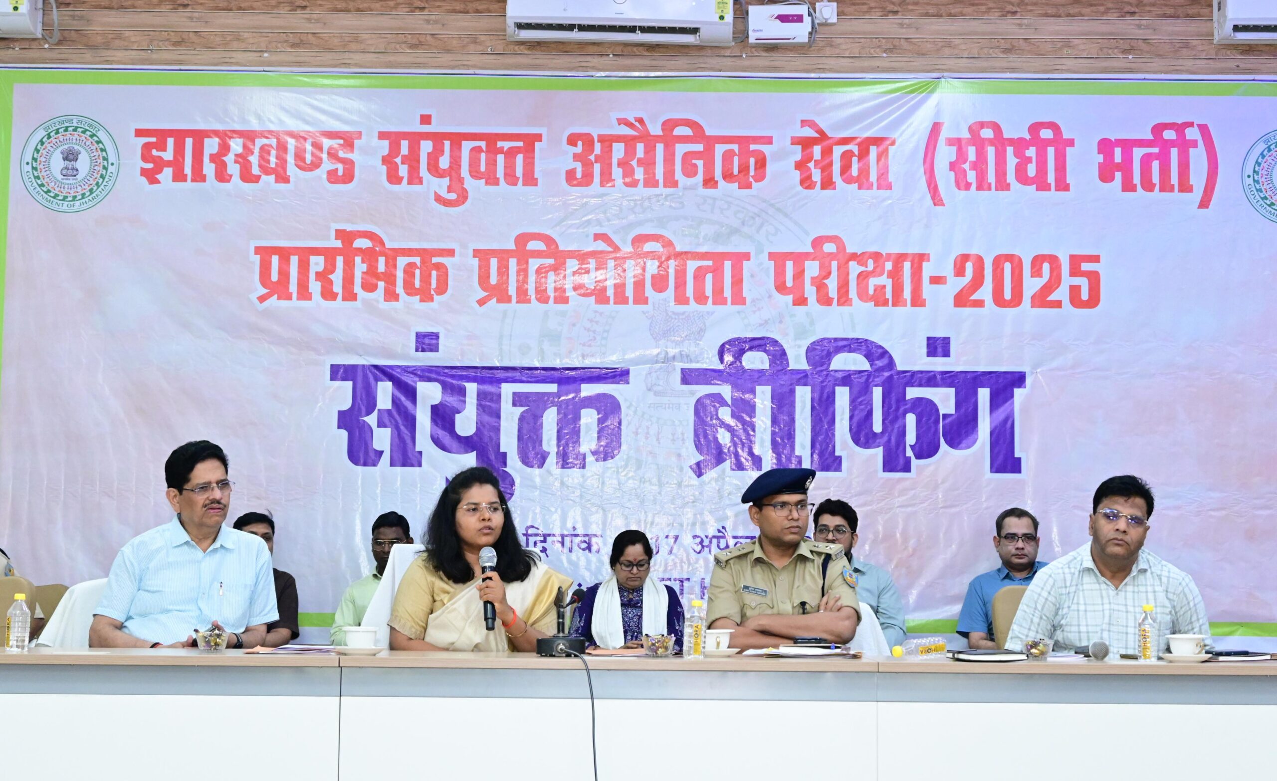 Chatra : आगामी 19 अप्रैल 2026 (रविवार) को आयोजित होने वाली झारखण्ड संयुक्त असैनिक सेवा (सीधी भर्ती) प्रारंभिक प्रतियोगिता परीक्षा-2025 को लेकर जिला प्रशासन पूरी तरह सतर्क एवं प्रतिबद्ध है। इसी क्रम में आज जिला खनिज फाउंडेशन ट्रस्ट सह प्रशिक्षण भवन हॉल, चतरा में उपायुक्त श्रीमती कीर्तिश्री जी एवं पुलिस अधीक्षक श्री सुमित कुमार अग्रवाल द्वारा संयुक्त ब्रीफिंग आयोजित कर परीक्षा व्यवस्था की विस्तृत समीक्षा की गई। संयुक्त ब्रीफिंग के दौरान सभी दंडाधिकारियों, पुलिस पदाधिकारियों एवं केंद्राधीक्षकों को परीक्षा को कदाचारमुक्त, शांतिपूर्ण एवं सुव्यवस्थित ढंग से संपन्न कराने हेतु आवश्यक दिशा-निर्देश दिए गए। जिले में कुल 12 परीक्षा केंद्र बनाए गए हैं, जहां 4280 परीक्षार्थी परीक्षा में सम्मिलित होंगे। परीक्षा दो पालियों में आयोजित होगी। प्रथम पाली के लिए अभ्यर्थियों का रिपोर्टिंग समय सुबह 8:00 बजे निर्धारित है, जबकि परीक्षा का आयोजन पूर्वाह्न 10:00 बजे से दोपहर 12:00 बजे तक किया जाएगा। वहीं द्वितीय पाली के लिए रिपोर्टिंग समय दोपहर 1:00 बजे निर्धारित है तथा परीक्षा अपराह्न 3:00 बजे से सायं 5:00 बजे तक संपन्न होगी। उक्त परीक्षा के सफल एवं निष्पक्ष संचालन को सुनिश्चित करने हेतु अनुमंडल पदाधिकारी स्तर से भी आदेश जारी किए गए हैं।भारतीय नागरिक सुरक्षा संहिता (B.N.S.S)-2023 की धारा-163 (पूर्व में धारा 144 दंड प्रक्रिया संहिता) के तहत सभी परीक्षा केंद्रों के 200 मीटर की परिधि में निषेधाज्ञा लागू रहेगी। इस परीक्षा के लिए निर्धारित केंद्रों में नाजरेथ विद्या निकेतन हाई स्कूल चतरा, नाजरेथ विद्या निकेतन मिडिल स्कूल चतरा, नाजरेथ स्कूल (इंग्लिश मीडियम) चतरा, उपेंद्रनाथ वर्मा इंटर कॉलेज चतरा, डीएवी पब्लिक स्कूल चतरा, रामेश्वर लाल खंडेलवाल विद्या मंदिर चतरा, एसएस गर्ल प्लस 2 हाई स्कूल, गौरक्षणी रोड चतरा, चतरा कॉलेज चतरा, इंदुमती टिबरेवाल सरस्वती विद्यामंदिर हाई स्कूल चतरा, राज्य संपोषित प्लस 2 हाई स्कूल चतरा, पीएम श्री स्कूल जवाहर नवोदय विद्यालय, सिमरिया रोड चतरा एवं आरडीएस इंटर कॉलेज चतरा शामिल हैं। निषेधाज्ञा के तहत परीक्षा केंद्रों के आसपास किसी भी प्रकार का घातक हथियार या विस्फोटक पदार्थ लेकर चलना पूर्णतः प्रतिबंधित रहेगा। अनावश्यक भीड़, जुलूस निकालना, लाउडस्पीकर या अन्य ध्वनि विस्तारक यंत्रों का उपयोग तथा शांति भंग करने वाली किसी भी गतिविधि पर सख्त रोक रहेगी। इसके अतिरिक्त परीक्षा में कदाचार करना या उसमें संलिप्त होना तथा परीक्षा संबंधी सामग्री का वितरण या प्रचार-प्रसार भी पूर्णतः वर्जित रहेगा।