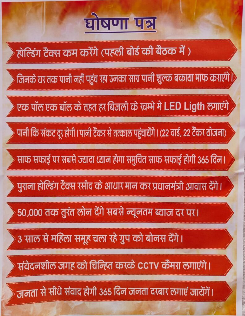 चतरा। शहर की तंग गलियों में पानी की प्यास, बिजली की किल्लत और टैक्स की मार से त्रस्त लोगों के चेहरों पर मुस्कान लाने का वादा किया अध्यक्ष प्रत्याशी अमन कुमार ने। इभा पैलेस में आयोजित प्रेस कॉन्फ्रेंस में उन्होंने घोषणा पत्र जारी कर कहा, “जनता मुझे मौका देगी तो पहली प्राथमिकता आपकी राहत ही होगी। बोर्ड की पहली बैठक में होल्डिंग टैक्स घटाने का प्रस्ताव लाऊंगा। जिन घरों तक पानी नहीं पहुंचा, उनका बकाया शुल्क माफ करवाऊंगा।”अमन ने शहर को रोशन करने का सपना दिखाया। “एक पोल एक बल्ब योजना से हर खंभे पर एलईडी लगेगी, रातें सुरक्षित होंगी। 22 वार्डों में 22 टैंकर योजना से प्यास बुझेगी। 365 दिन साफ-सफाई, पुरानी टैक्स रसीद पर पीएम आवास का लाभ—ये सब होगा।” स्वरोजगार को बढ़ावा देने के लिए 50 हजार तक का सस्ता लोन, महिला समूहों को बोनस और संवेदनशील जगहों पर सीसीटीवी लगाने का ऐलान किया।”हर रोज जनता दरबार लगाऊंगा, आपकी आवाज सीधे सुनेगा,” उन्होंने भावुक होकर कहा। चतरा की जनता विकास और पारदर्शिता के इस वादे पर भरोसा जताएगी, ये उनका विश्वास है। नगर चुनाव में ये घोषणा पत्र गूंज बन सकता है।