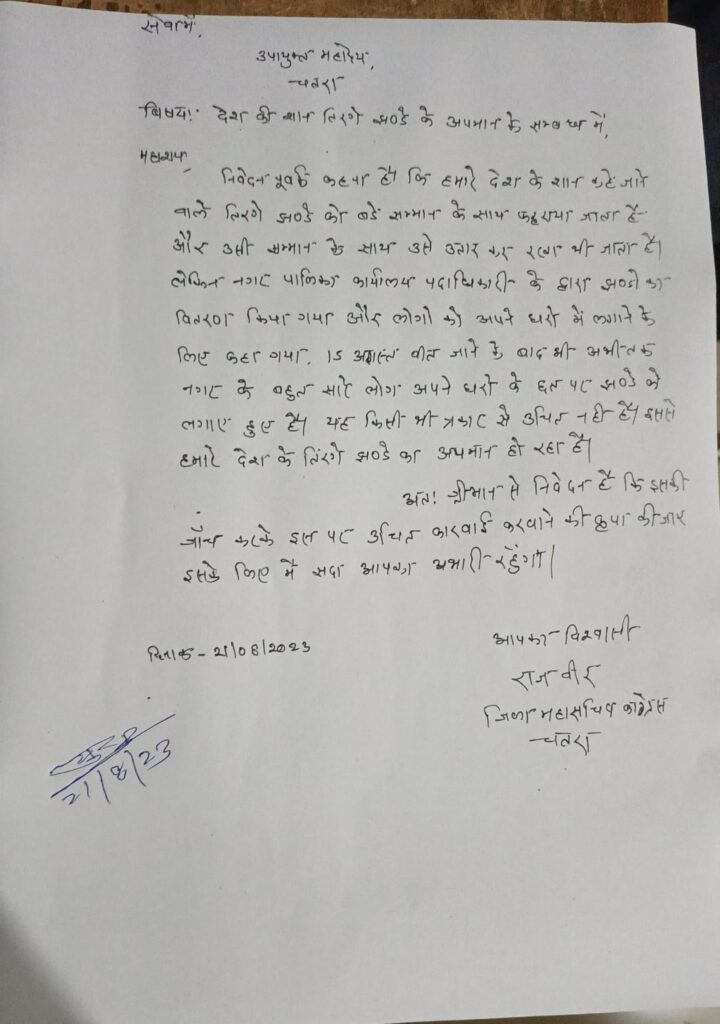 को 6 दिन बाद भी कई घर,गाड़ी, साइकिल और कार्यालय के गेट पे भी तिरंगा दिख रहा है और कई तिरंगे फटते जा रहे हैं, इस संबंध में उचित कदम उठाते हुए कांग्रेस जिला महासचिव राजवीर जी ने उपायुक्त को लिखित आवेदन दिया। राजवीर ने उपायुक्त को निवेदन पूवर्क आवेदन के माध्यम से कहा है हमारे देश भारत के आन बान और शान कहे जाने वाले तिंरगा झण्डे को बड़े सम्मान के साथ फहराया जाता है और उसी सम्मान के साथ उसे उतार कर रखा भी जाता है, लेकिन नगर परिषद कार्यालय पदाधिकारी के द्वारा झण्डो का ‘वितरण किया गया और लोगो को अपने घरो में लगाने के लिए कहा गया, 15 अगस्त बीत जाने के बाद भी अभी तक नगर के बहुत सारे लोग अपने घरो के छत पर झण्डे के लगाए हुए है। यह किसी भी प्रकार से उचित नहीं है। इससे हमारे देश की आन,बान और शान तिरंगे झण्डे का अपमान हो रहा है। और कहां की जांच कर उचित क्रायवाही करने की कृपा को जाए।
