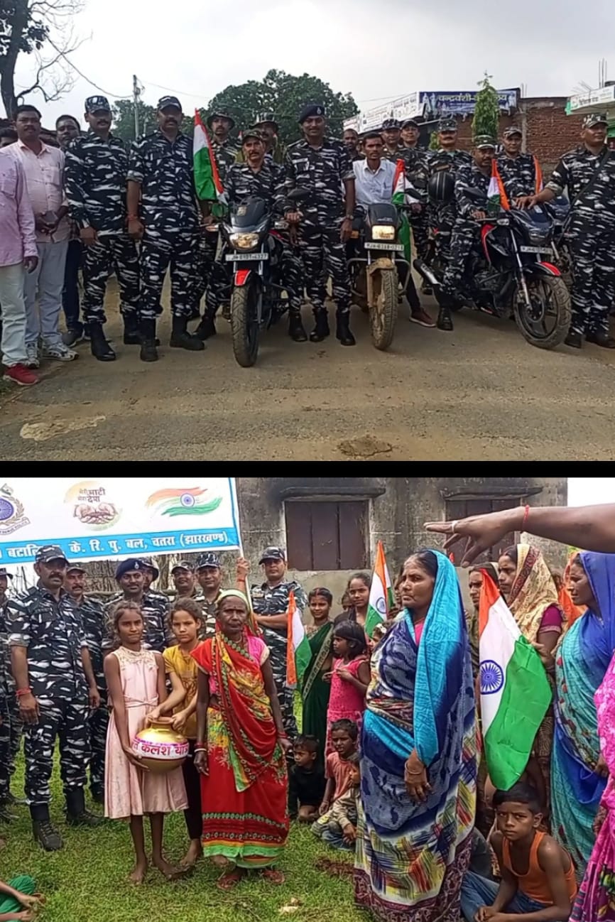 लावालौंग: प्रखण्ड मुख्यालय क्षेत्र अन्तर्गत मेरी माटी मेरा देश कार्यक्रम के तहत  रविवार को लावालौंग के आस पास गावों तथा अन्य पंचायत में कार्यक्रम आयोजित किया गया। सीआरपीएफ 190 बटा0 के कमाण्डेन्ट श्री मनोज कुमार के दिशा-निर्देश में A/11  बटालियन के  सहायक   कमांडेंट  प्रशांत गणेश  हुंकरे के नेतृत्व में  लावालौंग पंचायत के बांदू, पूर्णाडीह, मदनडीह, पारामातू, चानी, हुटरू, जलमा, सिकनी, मनवातरी, बेलाटांड ईत्यादि दर्जनों गांव में कार्यक्रम आयोजित कर पवित्र मिट्टी को गांव से एकत्रित कर उसे कलश में संग्रहित किया गया। जिसमें सीआरपीएफ के  जवानों द्वारा लाए गए । कलश में गांव के  बच्चों,गांव के महिला,पुरुष व जनप्रतिनिधियों ने पवित्र मिट्टी को भरा। इसके बाद जवानों व ग्रामीणों ने कतारबद्ध होकर डीजे साउंड में देश भक्ति गीतों के साथ क्षेत्र में दौरा किया । इस दौरान सीआरपीएफ A/11बटालियन के सहायक कमांडेंट प्रशांत गणेश हुंकरे ने कहा कि हम जहां रहते हैं वहां की मिट्टी हमें अपने प्राणों से भी प्यारी है। इस बात का एहसास दिलाने के लिए प्रधानमंत्री द्वारा यह कार्यक्रम प्रत्येक देशवासियों के लिए अत्यंत महत्वपूर्ण है। ऐसे कार्यक्रमों से व्यक्ति के अंदर अपने जन्मभूमि के प्रति प्रेम को दर्शाता है। मौके पर लावालौंग पंचायत मुखिया नेमन भारती, उपमूखिया रीता देवी,  उपमुखिया पति सह समाजसेवी मुकेश कुमार यादव, पंचायत समिति सदस्य मंजू देवी, पंचायत समिति सदस्य सह समाजसेवी अशोक कुमार यादव, वार्ड सदस्य नरेश कुमार राम, समाजसेवी बसंत पाण्डे, सुनील कुमार