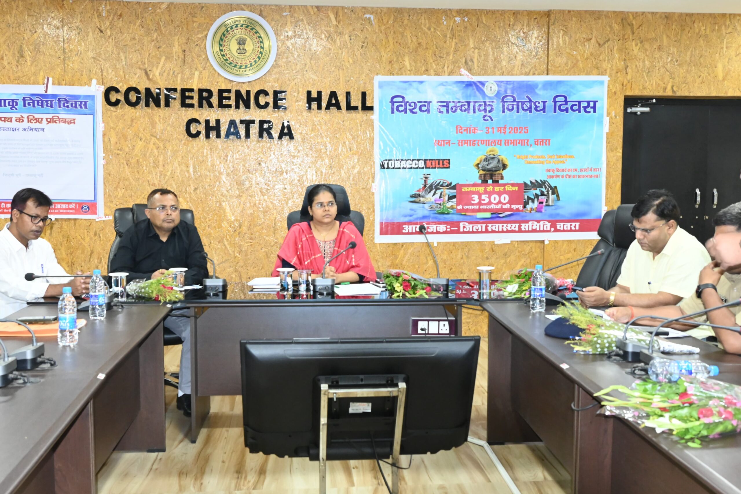 चतरा उपायुक्त श्रीमती कीर्तिश्री जी ने समाहरणालय के सभा कक्ष में विश्व तम्बाकू निषेध दिवस पर अधिकारियों के साथ बैठक की। इस दौरान उपायुक्त ने तम्बाकू के सेवन से बचने के साथ साथ इसके रोकथाम के उपायों पर चर्चा की। डीसी ने इसके रोक थाम के लिए सभी स्कूलों में तम्बाकू से होने वाले नुकसान से संबंधित जानकारी के लिए बैनर लगाने की बात कही। इसके लिए जिला शिक्षा पदाधिकारी और जिला शिक्षा अधीक्षक से समन्वय स्थापित कर विद्यालय प्रबंधन समिति से बैनर बनवाने की बात कहीं। उपायुक्त ने विद्यालय परिधि के 100 मीटर के दायरे में तंबाकू बिक्री करने के साथ 18 वर्ष से कम उम्र के बच्चों को इसको न बेचने और न खरीदने पर देने की बात कही। आगे कहा कि तंबाकू मीठा जहर है पूरे समाज को इसका बहिष्कार करना चाहिए।