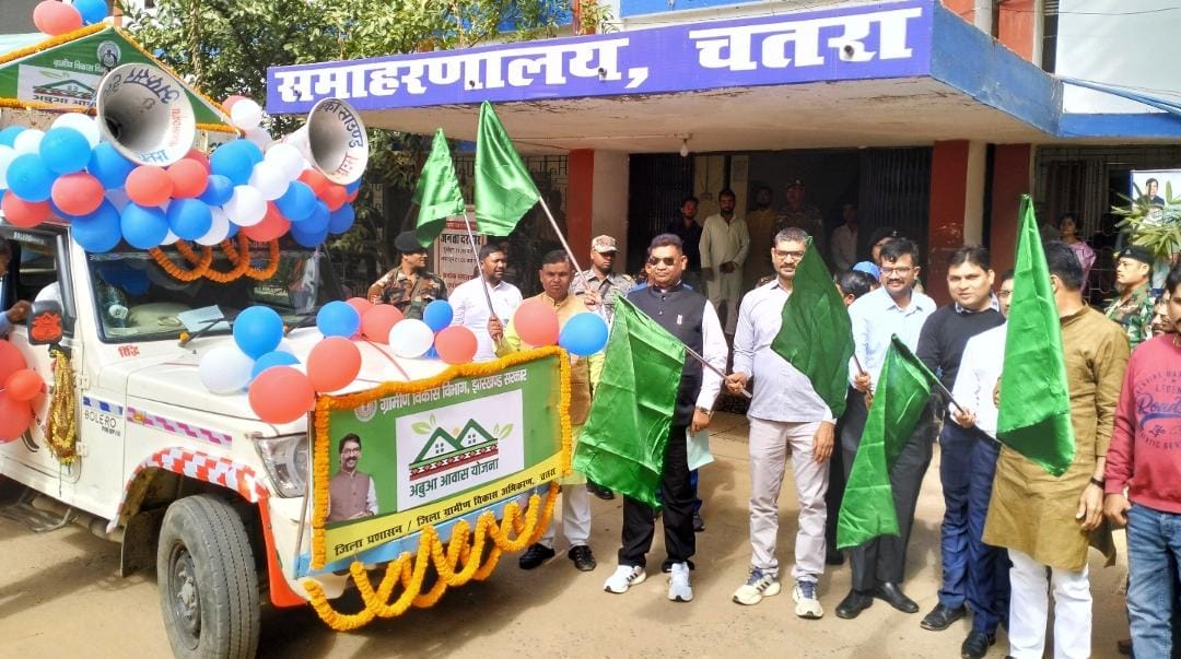 चतरा : ग्रामीण विकास विभाग झारखंड सरकार के निर्देशानुसार आज जिला ग्रामीण विकास अभिकरण चतरा द्वारा अबुआ आवास योजना के बृहद प्रचार प्रसार हेतु जागरूकता रथ को रवाना किया गया। इस कार्यक्रम में  राज्य के मंत्री श्रम नियोजन प्रशिक्षण एवं कौशल विकास विभाग झारखंड सरकार सत्यानंद भोक्ता शामिल हुएं। उपायुक्त अबु इमरान ने माननीय मंत्री के आगमन पर उन्हें पौधा भेंट कर उनका स्वागत किया। इसके पश्चात माननीय मंत्री श्री सत्यानंद भोक्ता, उपायुक्त श्री अबु इमरान, उप विकास आयुक्त उत्कर्ष गुप्ता ने समाहरणालय परिसर से जागरूकता रथ को हरी झंडी दिखाकर रवाना किया।