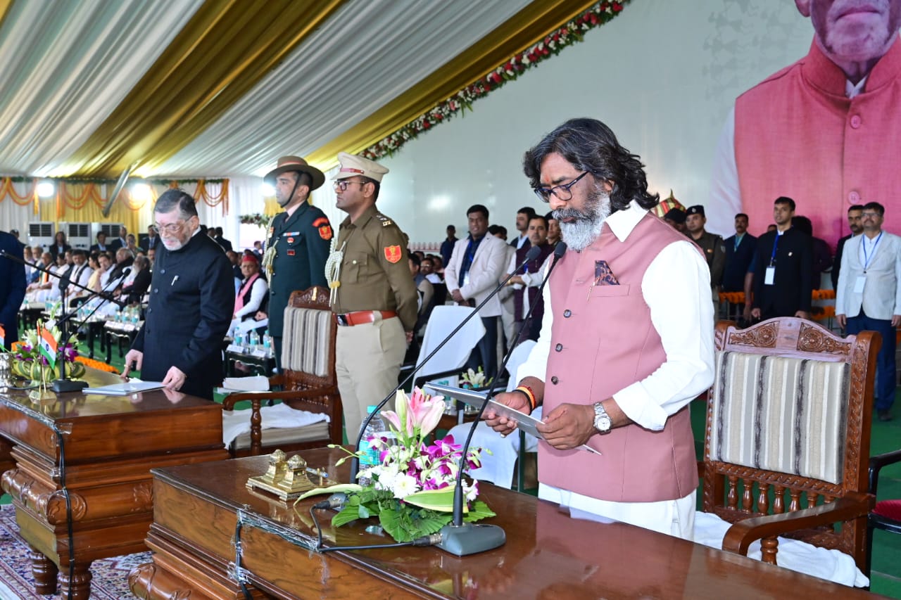 Ranchi : माननीय राज्यपाल श्री संतोष कुमार गंगवार ने आज मोरहाबादी, राँची में आयोजित एक भव्य शपथ ग्रहण समारोह में श्री हेमन्त सोरेन को झारखंड राज्य के मुख्यमंत्री पद एवं गोपनीयता की शपथ दिलाई। इस अवसर पर माननीय राज्यपाल महोदय ने श्री सोरेन को हार्दिक बधाई व शुभकामनाएँ दीं। इससे पूर्व मुख्य सचिव श्रीमती अलका तिवारी ने माननीय मुख्यमंत्री श्री हेमन्त सोरेन की नियुक्ति संबंधी वारंट को पढ़ा तथा राज्यपाल के प्रधान सचिव डॉ० नितिन कुलकर्णी द्वारा माननीय मुख्यमंत्री श्री हेमन्त सोरेन को शपथ ग्रहण हेतु आमंत्रित किया गया। उक्त शपथ ग्रहण समारोह में नेता प्रतिपक्ष, लोक सभा श्री राहुल गाँधी, नेता, विपक्ष, राज्य सभा श्री मल्लिकार्जुन खरगे, पश्चिम बंगाल की मुख्यमंत्री सुश्री ममता बनर्जी, पंजाब के मुख्यमंत्री श्री भगवंत मान, तमिलनाडु के माननीय उप मुख्यमंत्री श्री उदय स्टालिन, कर्नाटक के उप मुख्यमंत्री श्री डी०के० शिवकुमार, तेलंगाना के उप मुख्यमंत्री श्री मल्लू भट्टी विक्रमार्क, झारखण्ड राज्य के पूर्व मुख्यमंत्री एवं सांसद श्री शिबू सोरेन, उत्तर प्रदेश के पूर्व मुख्यमंत्री श्री अखिलेश यादव, दिल्ली के पूर्व मुख्यमंत्री श्री अरविंद केजरीवाल, बिहार के पूर्व उप मुख्यमंत्री एवं नेता प्रतिपक्ष, बिहार विधान सभा श्री तेजस्वी यादव, माननीय लोक सभा सांसद श्री पप्पू यादव, राज्यसभा सांसद श्री राघव चड्ढा समेत सहित कई अन्य विशिष्ट अतिथिगण, सांसदगण, विधायकगण तथा भारतीय प्रशासनिक सेवा व पुलिस सेवा के वरीय पदाधिकारीगण एवं आमजन मौजूद थे।
