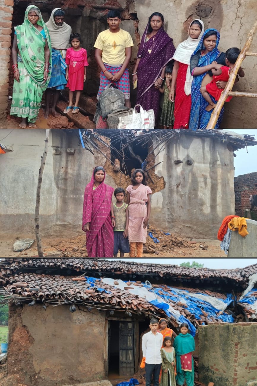 लावालौंग/चतरा : प्रखण्ड क्षेत्र में लगातार हो रही बारिश से प्रखंड क्षेत्र में तबाही मचा दी है। कटिया पंचायत के मसो० प्रमिला देवी,डब्लू भुइयां,सरस्वती देवी,टींकू भुइयां,रविन्द्र भुइयां, रखेद गांव के अजित गंझू एवं बंदारू और बान्दू गांव सहित दर्जनों गांवों के अनेकों गरीबों के कच्चे मकान धराशायी हो गए हैं। सबसे अधिक प्रभावितों में प्रमिला देवी, डब्लू भुइयां, सरस्वती देवी, टींकू भुइयां, रविन्द्र भुइयां, अजीत गंझू सहित अन्य कई गरीब परिवार शामिल हैं।जिनके मकान पूरी तरह से टूट गए हैं। पीड़ित परिवारों के पास अब रहने के लिए सुरक्षित ठिकाना नहीं बचा है। कुछ लोग जान जोखिम में डालकर टूटे हुए मकानों में प्लास्टिक और तिरपाल लगाकर रह रहे हैं तो कुछ ने अस्थायी तंबू बनाकर जैसे-तैसे दिन काटने शुरू कर दिए हैं।इनमें महिलाएं,छोटे-छोटे बच्चे और बुजुर्ग भी शामिल हैं। जो भारी कष्ट में जीवन व्यतीत कर रहे हैं।स्थानीय लोगों का कहना है कि कई बार आवेदन देने के बावजूद उन्हें अब तक प्रधानमंत्री या अबुआ आवास योजना का लाभ नहीं मिला है।न ही किसी जनप्रतिनिधि या अधिकारी ने मौके पर पहुंचकर राहत सामग्री या सहायता उपलब्ध कराई है।ग्रामीणों नें प्रशासन से मांग की है कि अविलंब सर्वे कराकर प्रभावित परिवारों को सरकारी आवास योजना का लाभ दिया जाए। साथ ही तत्काल राहत के रूप में खाद्य सामग्री,तिरपाल और आवश्यक वस्तुएं उपलब्ध कराई जाएं ताकि बारिश के इस कठिन समय में पीड़ितों को थोड़ी राहत मिल सके।