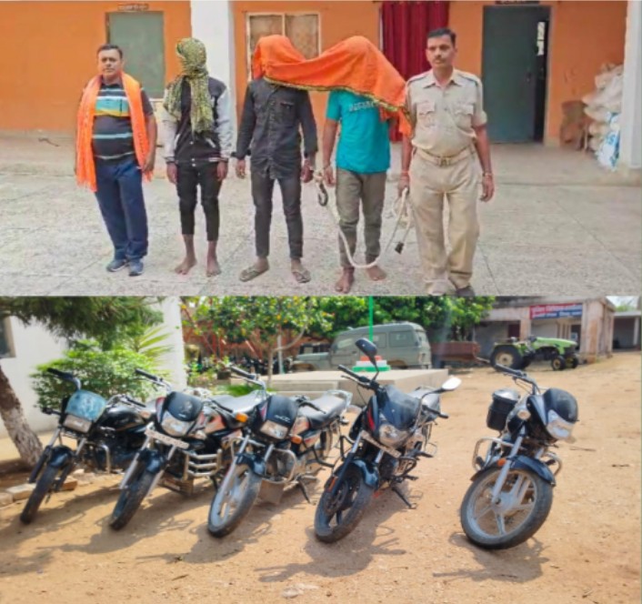 चतरा : ईटखोरी थाना क्षेत्र अंतर्गत ग्राम नगवाँ से सोनू कुमार पिता बासुदेव दांगी के घर के बरामदा में लगा दो CD DELUX मोटरसाईकिल अज्ञात चोरो द्वारा चोरी कर लेने से संबंधित सूचना प्राप्त हुई थी। सोनू कुमार पिता बासुदेव दांगी सा० बघमुण्डी वर्तमान सा०- नगवाँ थाना ईटखोरी जिला चतरा के लिखित आवेदन के आधार पर अज्ञात चोर के विरुद्ध ईटखोरी थाना कांड सं0-52/2024, दि०- 06.05.2024 धारा- 379 भा०द०वि० दर्ज किया गया था। पुलिस अधीक्षक महोदय चतरा के द्वारा कांड के संवेदनशिलता को देखते हुए त्वरित कार्रवाई एवं कांड का उदभेदन हेतू पुलिस उपाधीक्षक (मु०) चतरा के नेतृत्व में एक छापामारी दल का गठन किया गया। गठित टीम के द्वारा त्वरित कार्रवाई करते हुए चौपारण थाना क्षेत्र से सरदारपुर स्थित होटल एवं ग्राम डोईया से पाँच चोरी का मोटरसाईकिल के साथ तीन अप्राथमिकी अभियुक्तों को निरुद्ध किया गया है। गिरफ्तार अभियुक्तों के द्वारा इस कांड की घटना को कारित करने में अपनी संलिप्तता स्वीकार किये है।