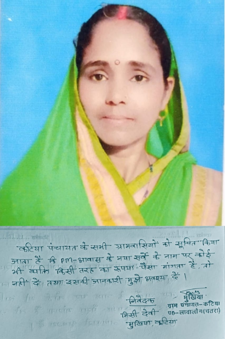 चतरा जिले के लावालौंग प्रखण्ड के कटिया पंचायत के मुखिया मिसी देवी ने अपने अलग अंदाज के लिए जानी जाती हैं, उन्होंने बताया कि हमे लगातार सूचना मिल रहीं है कि पीएम आवास योजना सर्वे के दौरान,और अबुआ आवास योजना के स्वीकृती के नाम पर कुछ बिचौलिए लाभुकों से पैसों की मांग कर रहे हैं, जो उचित नहीं है, जब तक पंचायत के मुखिया हम हैं, तबतक किसी भी लाभुक को कोई भी समस्या हो तो वो सीधा हमसे संपर्क करें! किसी भी बिचौलिए को पैसा नहीं दें, योग्य लाभुकों के लिए हम निःस्वार्थ भाव से सरकारी योजनाओं का लाभ दिलाने का कार्य हम करेंगे। “मुखिया मिसी” देवी ने भ्रष्टाचार के खिलाफ सख्त होते हुए बिचौलियों को चेतावनी देते हुए कही कि हमारे कार्यकाल में किसी भी ग्रामीण से आवास योजना या किसी अन्य योजनाओं का लाभ दिलाने के नाम पर मुद्रा मोचन किया गया तो हम उसके खिलाफ मुकदमा दर्ज करवाकर कानूनी कार्रवाई करेंगे। गरीबों से पैसा लेना सबसे बड़ा गुनाह है, और हम इसके सख्त खिलाफ है, आपको बताते चलें कि कटिया पंचायत के मुखिया ने एक पत्र जारी कर उसपर अपने मुखिया पद का मुहर लगा कर लोगों के बीच जारी किया और लोगों को बताया है कि किसी भी बिचौलियों के बातों में ना आए और अपने समस्याओं को सीधे मुखिया से बताए । आए दिन पीएम आवास योजना सर्वे के नाम पर, अबुआ आवास योजना स्वीकृत करवाने के नाम पर बिचौलियों द्वारा गरीब ग्रामीणों से पैसों की ठगी की जा रही है। ऐसे में योग्य लाभुक आवास योजना जैसे महत्वाकांक्षी योजना के लाभ से वंचित रह जा रहे हैं,ऐसे में कटिया मुखिया द्वारा ये ब्यान काफी सराहनीय है। और गरीब तबके के लाभुकों को काफी उम्मीद जगी है, और ये बात कबीले तारीफ है अब देखना ये है कि इसका कितना असर बिचौलियों पर पड़ता है।