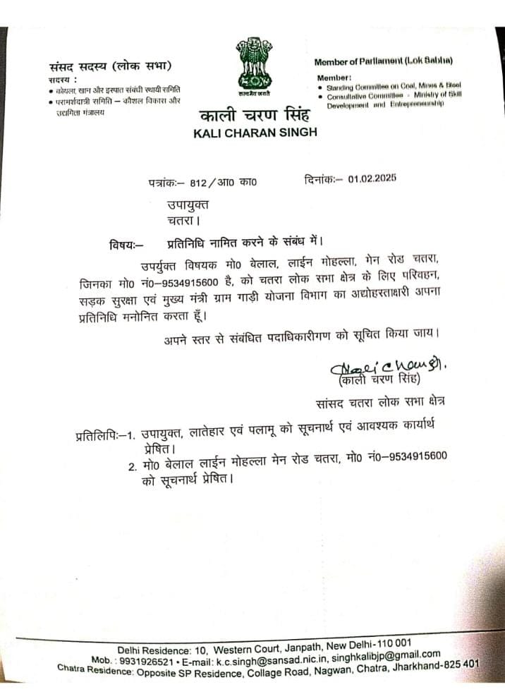 चतरा संसदीय क्षेत्र के सांसद कालीचरण सिंह ने चतरा निवासी मो० बेलाल को चतरा, लातेहार एवं पलामू जिला का सांसद परिवाहन प्रतिनिधि नियुक्त किया है. इस नियुक्ति के संबंध में सांसद कार्यालय से आधिकारिक पत्र जारी किया गया है. इससे पूर्व में भी संसद प्रतिनिधि रह चुके हैं जिसके बाद फिर से नई जिम्मेदारी के तहत मो० बेलाल को चतरा लोक सभा क्षेत्र के परिवहन सड़क सुरक्षा एवं मुख्यमंत्री ग्राम गाड़ी योजना विभाग से जुड़ी जनसमस्याओं को सांसद तक पहुंचाने और उनके समाधान के लिए पहल करने का दायित्व सौंपा गया है. और विभाग के लिये सांसद की अनुपस्थिति में सांसद प्रतिनिधि बैठक में शामिल होंगे.