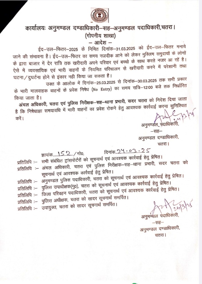 चतरा. सदर अनुमंडल पदाधिकारी जहुर आलम ने ईद-उल-फितर बाजार को लेकर शहर में नो इंट्री का समय परिवर्तन किया है. 25 से 30 मार्च तक रात तक नो एंट्री रहेगा. इस दौरान भारी मालवाहक वाहनो का प्रवेश बंद रहेगा. एसडीओ ने बताया कि 31 मार्च को ईद-उल-फितर मनाये जाने की संभावना है. इसे लेकर मुस्लिम समुदाय के लोगो द्वारा बाजार में देर रात तक विभिन्न सामानों की खरीदारी अपने परिवार व बच्चो के साथ करते नजर आ रहे है. ऐसे में व्यवसायिक व भारी वाहनो के नियमित परिचालन से खरीदारी करने में परेशानी व दुर्घटना होने से इनकार नहीं किया जा सकता है. इसे लेकर 30 मार्च तक नो इंट्री का समय रात नौ बजे से बढ़ा कर 12 बजे तक कर दिया गया है. इसके बाद वाहनो का परिचालन होगा. उन्होंने अंचल अधिकारी व सदर थाना प्रभारी को आदेश का अनुपालन करने का निर्देश दिया. मालूम हो कि रविवार की रात ईद बाजार को लेकर अब तक नहीं बढ़ा नो एंट्री का समय, रात नौ बजते ही मेन रोड में बड़े वाहनों के प्रवेश से ईद बाजार में डाल रहे हैं खलल से संबंधित खबर प्रसारित की गई थी, इसके बाद प्रशासन हरकत में आया और नो एंट्री का समय बढ़ाने का आदेश जारी किया गया.