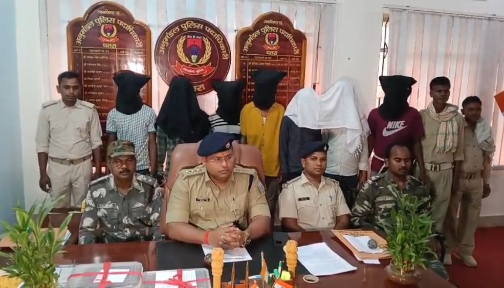 चतरा के प्रतापपुर थाना क्षेत्र के मरका मोड़ के पास बीते मंगलवार हथियार का भय दिखाकर डीजे गाड़ी से लूट करने के मामले का उद्भेदन चतरा पुलिस ने कर लिया है। लूट को अंजाम देने वाले 7 अपराधकर्मियों को पुलिस ने गिरफ्तार कर लिया है उनके पास ने पुलिस ने 1 देशी पिस्तौल 3 मोटरसाईकल और डीजे गाड़ी से लूटे गए 3 डीजे एम्प्लीफायर मशीन ,1 स्टैबलईजर और 1 मिक्सर मशीन के साथ चोरी के 6 मोबाइल फ़ोन भी बरामद किया है। अपराधियों की गिरफ़्तारी के बाद मीडिया को जानकारी देते हुए अनुमंडल पुलिस पदाधिकारी चतरा संदीप सुमन ने बताया की 13 मई को हंटरगंज थाना क्षेत्र के खजुरिया खुर्द के रहने वाले विमल भुईयां ने 8 अज्ञात नकाबपोशों के विरुद्द लूट की लिखित शिकायत प्रतापपुर थाना में दिया था इस संदर्भ में प्रतापपुर थाना कांड सं0-50/2025,दिनांक-14.05.2025 धारा-310(2) बी०एन०एस० दर्ज किया गया। जिन्होंने हथियार का भय दिखाकर घटना को अंजाम दिया था। पुलिस ने घटना की जानकारी मिलते ही खोजबीन शुरू कर दी थी। घटना को 8 अपधियों ने मिलकर अंजाम दिया था जिनमे से 7 को गिरफ्तार कर लिया गया है 1 अभियुक्त जो बिहार का रहने वाला है अभी पुलिस की गिरफ्त से फरार है उसे भी जल्द गिरफ्तार कर लिया जायेगा। गिरफ्तार किये गए सभी अपराधी प्रतापपुर प्रखंड के ही रहने वाले हैं जिनसे पूछताछ की जा रही है।