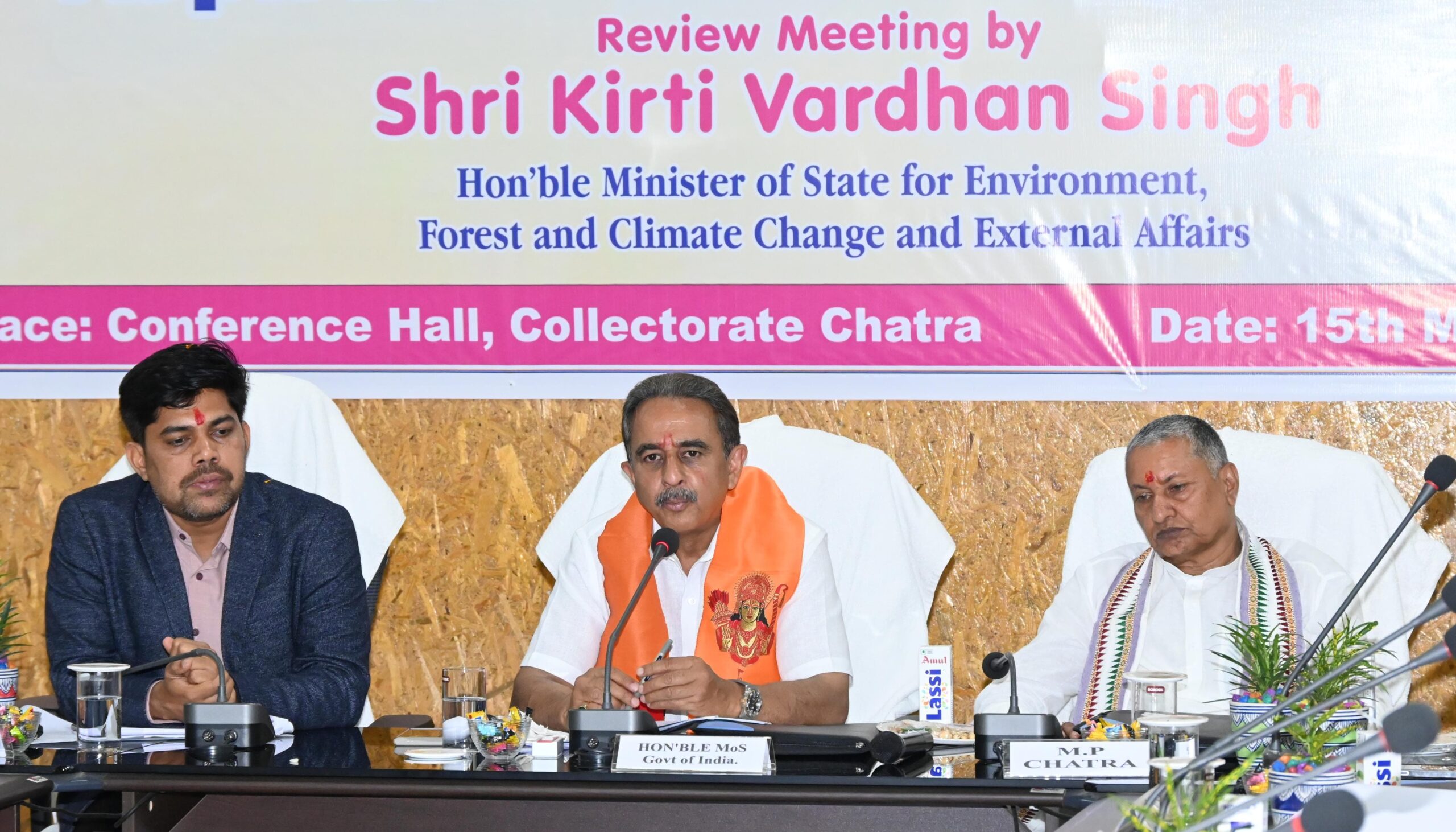 Chatra : श्री कीर्तवर्धन सिंह, केंद्रीय पर्यावरण,वन एवं जलवायु परिवर्तन तथा विदेश राज्य मंत्री,भारत सरकार के चतरा समाहरणालय आगमन पर जिला प्रशासन द्वारा पारंपरिक तरीके से एवं उपायुक्त श्री रमेश घोलप द्वारा पौधा और स्मृति चिन्ह भेंट कर उनका स्वागत किया गया। इसके उपरांत माननीय केंद्रीय पर्यावरण,वन एवं जलवायु परिवर्तन तथा विदेश राज्य मंत्री,भारत सरकार ने समाहरणालय सभा कक्ष में उपायुक्त श्री रमेश घोलप समेत जिलास्तरीय पदाधिकारियों के साथ उन्होंने नीति आयोग की ओर से निर्धारित विकास कार्यों की समीक्षा बैठक की। उक्त मौके पर माननीय सांसद चतरा लोकसभा क्षेत्र श्री कालीचरण सिंह, माननीय विधायक चतरा विधानसभा क्षेत्र श्री जनार्दन पासवान, माननीय विधायक सिमरिया विधानसभा क्षेत्र श्री उज्ज्वल दास, माननीय विधायक बड़कागांव विधानसभा क्षेत्र रोशन लाल चौधरी, जिला परिषद अध्यक्ष श्रीमती ममता कुमारी, जिला परिषद उपाध्यक्ष ब्रिज किशोर तिवारी उपस्थित थे।