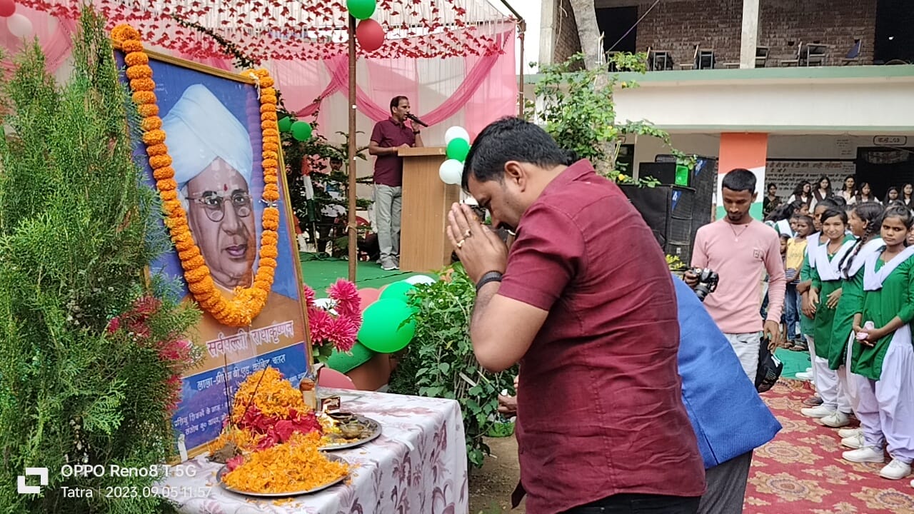 कान्हाचट्टी:बी.के.+2 उच्च विद्यालय कन्हाचट्टी में धूमधाम से शिक्षक दिवस मनाया. इस अवसर पर बतौर मुख्य अतिथि ज़िप उपाध्यक्ष बिरजू तिवारी के आगमन पर छात्र-छात्राओं द्वारा भव्य स्वागत किया गया. कार्यक्रम का शुभारंभ बतौर मुख्य अतिथि श्री तिवारी ने पूर्व राष्ट्रपति डॉ० सर्वपल्ली राधाकृष्णन जी की तस्वीर पर पुष्पार्पण कर व दीप प्रज्वलित कर किया. मौके पर छात्र-छात्राओं द्वारा सांस्कृतिक कार्यक्रम प्रस्तुत किया गया.तत्पश्चात विद्यालय प्रधानाचार्य पवन कुमार द्वारा मुख्य अतिथि को पुष्पगुच्छ व भगवत गीता देकर सम्मानित किया। छात्र-छात्राओं को संबोधित करते हुए श्री तिवारी ने कहा कि शिक्षक मोमबत्ती की तरह होते हैं जो स्वयं जलकर दूसरे को रोशनी प्रदान करते हैं. शिक्षक की शिक्षा तभी फलीभूत होती है जब विद्यार्थी पूर्ण मनोयोग से शिक्षा ग्रहण को तत्पर हो.शिक्षक केवल पढ़ाते ही नहीं हैं बल्कि विद्यार्थी की गलतियों को सुधार कर जिम्मेदार नागरिक बनाते हैं जीवन में विजय और सफलता प्राप्त करने के लिए शिक्षा एक बड़ी क्षति होती है इसीलिए देश के भविष्य को और युवाओं के जीवन की जिम्मेवारी शिक्षक को दी जाती है। एक शिक्षक ही बच्चों को बचपन से सामाजिक, मानसिक और बौद्धिक रूप से काबिल बनाता है।. इस अवसर पर छात्र-छात्राओं ने शिक्षकों को उपहार देकर सम्मानित किया. मौके पर प्रखण्ड प्रमुख इंदू देवी, भाजपा मंडल अध्यक्ष सतीश सिंह, संजय सर,गौतम सर, इकबाल सर, अरविंद सर, आर्यन सर रामाकांत सर, नवल सिन्हा, प्रकाश राम, प्रदीप पासवान, कमांडो रजक समेत अनेकों गणमान्य लोग उपस्थित थे