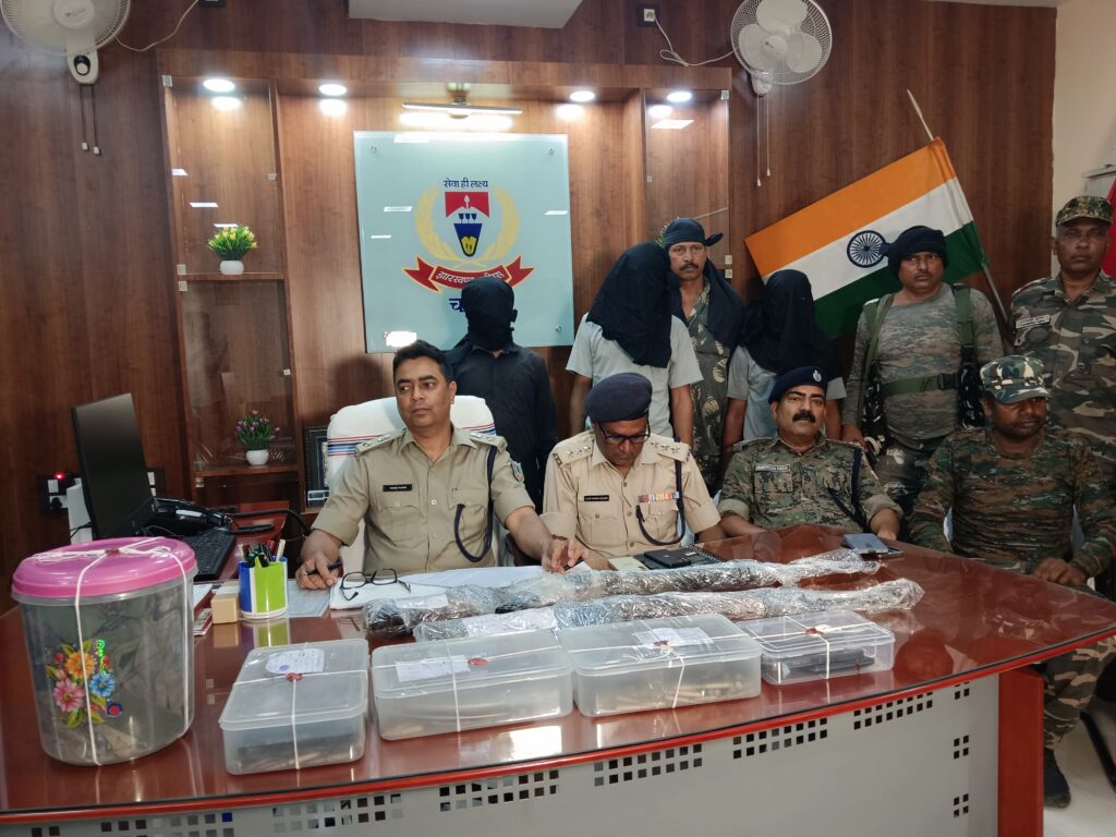 चतरा पुलिस अधीक्षक को गुप्त सूचना प्राप्त हुई कि T.S.P.C नक्सली संगठन के कमांडर हरेन्द्र गंझू, कुणाल गंझू, इरफान गंझु अपने अन्य सशस्त्र दस्ता सदस्यो के साथ चतरा- पलामू के सीमावर्ती क्षेत्र कुन्दा थाना के सिकीदाग, कुजरम के जंगली क्षेत्र में किसी बड़ी घटना को अंजाम देने के लिए एकत्रीत हुए है। उक्त सूचना के सत्यापन एवं आवश्यक कार्रवाई हेतु अनु०पु०पदा० सिमरिया के नेतृत्व में छापामारी टीम का गठन किया गया। जिसमें पु०नि० अवधेश सिंह प्रतापपुर अंचल, थाना प्रभारी कुन्दा एवं थाना प्रभारी लावालौंग को शामिल किया गया। उक्त छापामारी टीम द्वारा त्वरित कार्रवाई करते हुए ग्राम सिकिदाग के पश्चिम मेरूहनिया टॉड नारीदरी नदी के पास से भागने के क्रम में हथियारबंद तीन उग्रवादीयों को गिरफ्तार किया गया। शेष उग्रवादी जंगल एवं पहाड का लाभ उठाकर भागने में सफल रहे। छापामारी के क्रम नक्सली इरफान गंझु के पास से 1. INSAS राईफल लोडेड अवस्था में तथा पाउच में दो मैगजीन, एवं कुल 161 राउण्ड 5.56 MM जिन्दा गोली व महेन्द्र गंझू उर्फ पाल्टा के पास एक SLR राईफल लोडेड अवस्था में तथा पाउच में। मैगजीन तथा 164 राउण्ड 7.62 MM का जिन्दा गोली वहीं छोटु भुईया के पास से पाउच में एक मैगजीन तथा AK47 का 30 राउण्ड जिंदा गोली बरामद किया गया। इस संबंध में कुन्दा थाना कांड सं0 29/24 दिनांक 14.06.2024 धारा 147/148/149/385/387/120(B) भा0द0वि0, 25(1-A)/26/35 आर्म्स एक्ट एवं 17 (i) (ii) CLA एक्ट अंकित किया गया है।