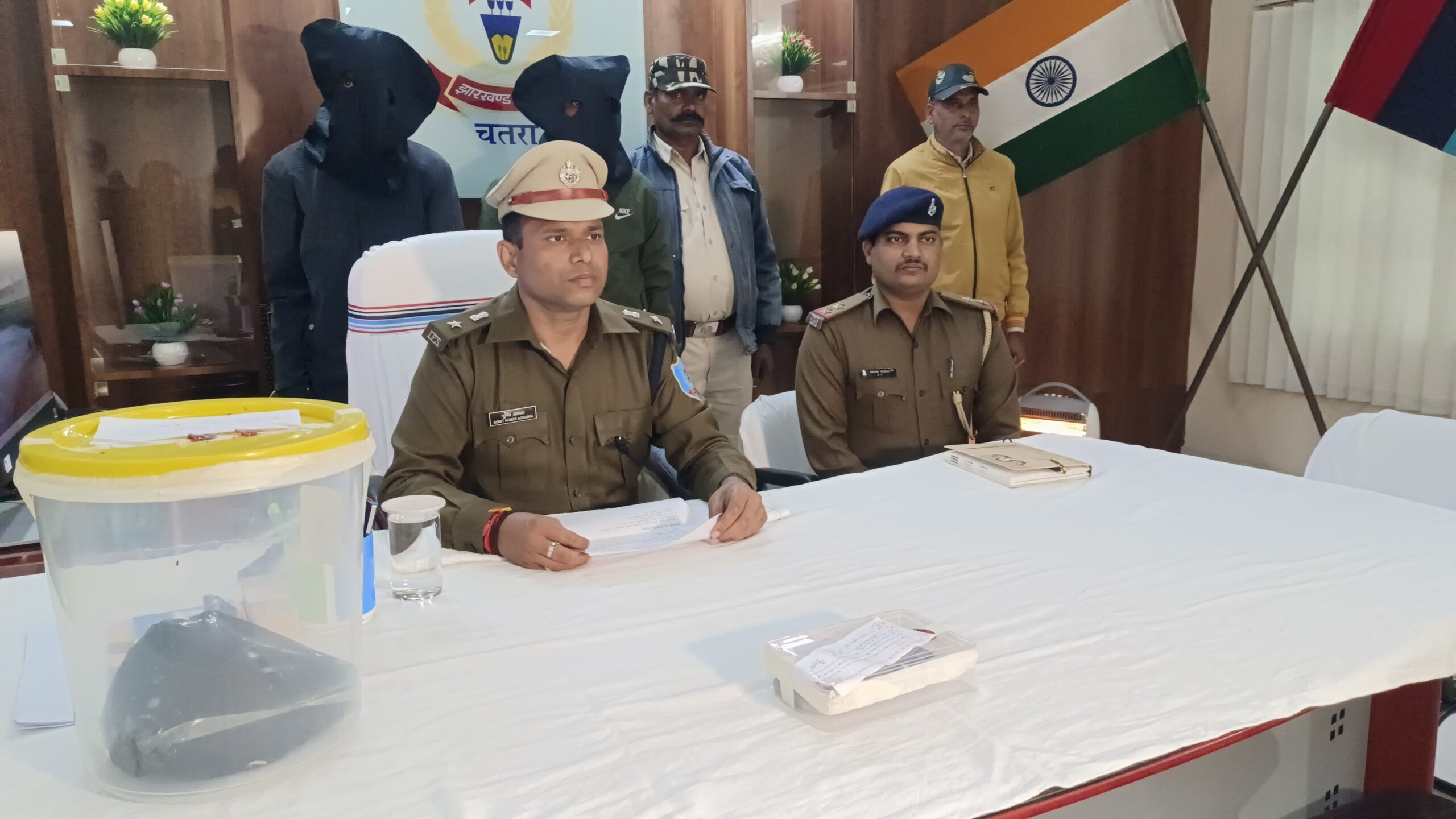 चतरा। जिले के गिद्धौर थाना पुलिस ने आज गुरुवार को मादक पदार्थ अफीम के खिलाफ बड़ी कार्रवाई की है। थाना क्षेत्र के लोटार डैम के पास से पुलिस ने 03 किलो 12 ग्राम अफीम के साथ दो तस्करों को गिरफ्तार किया। समाहरणालय परिसर स्थित अपने कार्यालय कक्ष में आयोजित प्रेस वार्ता में एसपी सुमित अग्रवाल ने बताया कि पुलिस को गुप्त सूचना मिली थी कि थाना क्षेत्र के लोटार डैम के पास कुछ तस्कर अफीम की खरीद बिक्री करने वाले हैं। सूचना के आधार पर एसडीपीओ सिमरिया की अगुवाई में एक टीम का गठन किया गया। टीम ने त्वरित कार्रवाई करते हुए दो संदिग्धों के पास से एक प्लास्टिक में रखा अफीम बरामद कर लिया। उन्होंने बताया कि बरामद अफीम की अनुमानित मूल्य लगभग 15 लाख रु है। गिरफ्तार तस्करों में गिद्धौर थाना क्षेत्र के सलगा गांव के कैलाश यादव का पुत्र पप्पू कुमार(18 वर्ष) और पांडेय टोला के स्व लाटो महतो का पुत्र बबलू कुमार महतो(32 वर्ष) हैं।इस संबंध में गिद्धौर थाना कांड संख्या-103/25, दिनांक-11.12.2025, धारा-17 (सी0)/18 (बी0)/21 (सी0)/22 (सी0)/27 (ए)/28/29 एनडीपीएस एक्ट दर्ज कर तस्करों को जेल भेज दिया गया है।